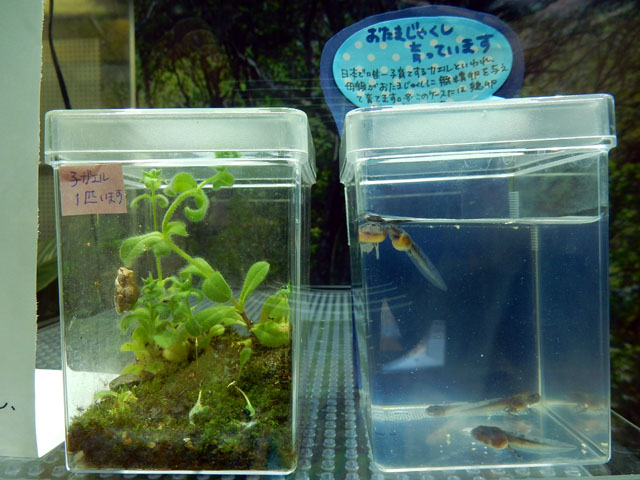 先週訪れた春先の多摩動物公園訪問記・その4をお届けさせていただきます。・°・。キジ・ハト舎をあとにして、昆虫生態園に向かいました。・°・。大温室のエントランス部にあるコーナーでは、沖縄方面の亜熱帯の生き物たちが展示されておりますが、アイフィンガーガエルさんのオタマジャクシが公開されておりました(*゜0゜)日本で唯一子育てをするカエルだそうですが、展示中のオタマジャクシさんには鶏卵を与えているとのことでした(o^-^o) 沖縄の蝶が生体展示されている大温室に入ると、亜熱帯特有のもわっとする湿り気を帯びた暖かい空気に包まれました。・°・。重い扉を開けて最初に出迎えて?くれたのは、真正面からこちらを見ているイシガケチョウさんでした(^^) 地図のような羽模様が天井からの光を透かしていてステキでした♪