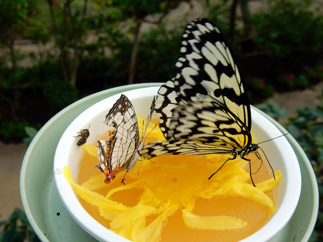 先週訪れた春先の多摩動物公園訪問記・その5をお届けさせていただきます。・°・。大温室では大好きなブーゲンビレアがたくさん咲いておりました(^^) 吸蜜台のひとつにはオオゴマダラ、イシガケチョウ、ミツバチ?さんがそろってお食事されておりました。オオゴマダラさんを真正面から観たことはありませんでしたが、垂直に立てた時の翅と翅の間隔が結構離れていることを初めて知りました(*゜0゜)