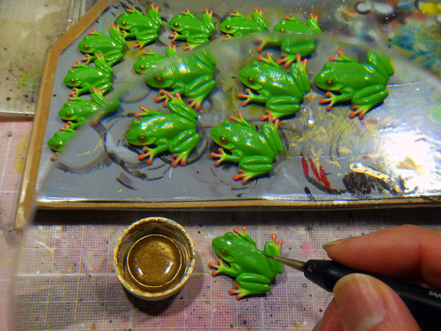 今日の冬の雨は寒さを少し和らげてくれました。・°・。虫の姿を見る機会の少なくなったこの季節、ほんの小さな虫でも視界に入ると目がとまります。。しかしながら静かな雨の日に見たのは、シトシトと降る雨に打たれたぺしゃんこの小さな蛾の哀れな姿でした。・°・。* 雨の日になぜだかよく重なるのが、カエル作品の色塗作業です。・°・。本日はオキナワアオガエル・ブローチの塗装でした。・°・。写真は目玉の金色を施しているところです。金属色の乾燥が早いので、うすめ液で適度な粘性に調節しながら作業を進めます。・°・。* 片栗粉の消費期限が迫る中、なんとか早く消費しようと天ぷらをこさえることにしました。・°・。第一弾は竹輪の磯辺揚げにしました。青海苔の買い置きがなかったので、焼き海苔を細かく千切って用いました。片栗粉の袋に書かれたレシピにワンポイントアドバイスとして、「お酢を小さじ1加えるとカラッと揚がります」とあったので従ったところ、本当にサクッとした歯応えでおいしく仕上りました。・°・。◎ アトリエ☆イボヤギ 木村大介