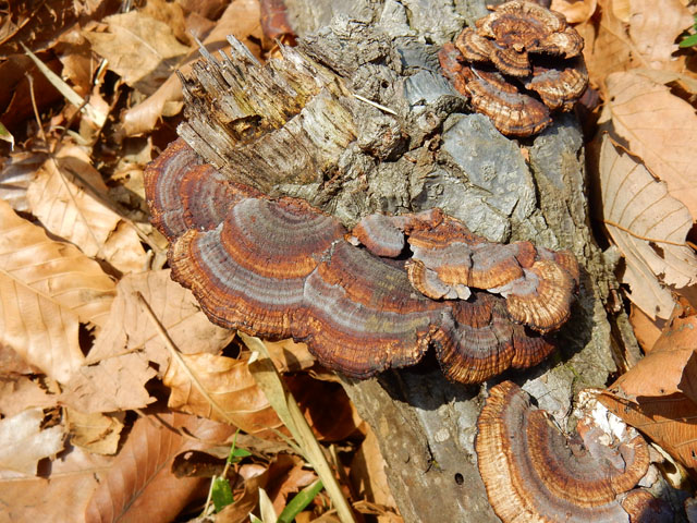 キノコの森散策の続きです。・°・。この雑木林ではカワラタケの仲間が多く見られましたが、鮮やかなオレンジ色のはサルノコシカケ科のようにも見えました。いずれのキノコも個性的で見ていて飽きませんでした。・°・。*