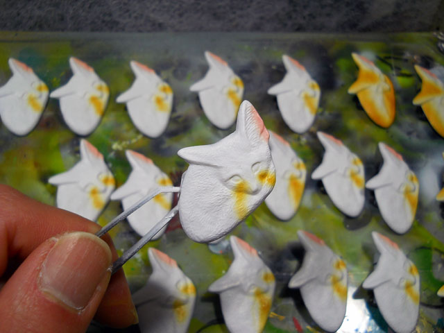 先週まとめて大量にこさえたミートソースですが、最近お気に入りの食べ方はスライスチーズ(とろけないタイプの方がベター)をゆで立てパスタに一枚載せて、その上から熱々のミートソースをたっぷりと掛けますと。。。30秒程でチーズがとろんとろんに溶けて、クリーミーでまろやかなおいしいチーズパスタに変わります。・°・。◎ 作り置きのお陰で手早く食事を済ませた後は、ブローチ作品たちの塗装を着々と進めました。・°・。写真はフェネックの目の下から口元に掛けての薄茶色のラインを先に描いているところです。・°・。そこだけ塗り終えたのを並べていると、おヒゲを生やしているみたいに見えてしまいます。・°・。* アトリエ☆イボヤギ 木村大介