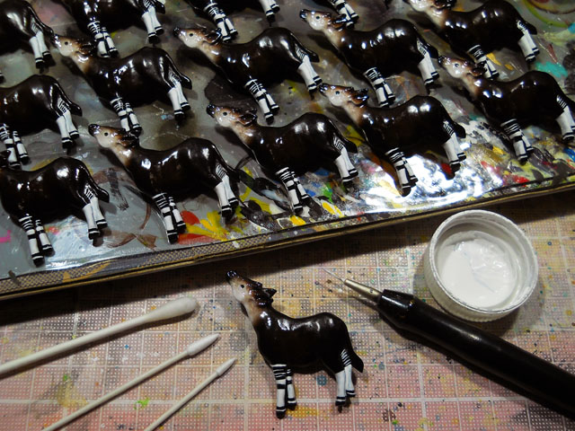 ゆでたまごトーストは、半熟玉子をざっくりとゴムベラで粗く刻んだのが好みです。・°・。サンドイッチも好きですが、自家製パンの端っこの少し厚めにカットしたのを、カリカリに焼いたのにボッテリと載せていただくのがたまりません。・°・。◎ 昼辺りからまとまった雨が降り続きましたが、夕方には空が明るくなってまいりました。・°・。本日もブローチ作品の塗装に黙々と取り組みました。・°・。写真はオカピの脚の白い模様を施しているところです。1ミリ以下の細い線も多いので、塗料の粘度が最適になるように調整しながら描き込んでゆきます。・°・。アパートの裏庭にある大きな夏みかんの樹が、今年は表の生り年のようで、たくさんの実を付けております。まだまだかなり酸っぱいですが、新緑の頃には甘さが増して来るので、今から待ち遠しいです。・°・。◎ アトリエ☆イボヤギ 木村大介