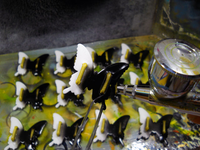 今日の最高気温は夏日にわずかに届かず、割りと過ごしやすいお天気でした。・°・。アトリエではマスキングを終えた帯留め作品の裏面塗装に入りました。・°・。カラスアゲハは表のベース色も黒色なので、塗装始めは裏も表も真っ黒け状態になります。・°・。● 多摩ZOO訪問記の続きをお伝えいたします。。大温室の蝶たちは寿命が近づくと羽もだいぶ傷んできて、ボロボロな個体も見受けられますが。。ランタナの花の蜜を懸命に吸い続けていたイシガケチョウは、おそらくもう飛べないのではないか。。?と思えるほど羽をひどく損傷しており、それはまるで宝の在処の破れた古地図のようでした。。それでも健気に生命を全うしようとしている姿に心打たれました。・°・。(+_+) 今回の訪問では、温室の外でもたくさんの虫たちと出会うことが出来ました。・°・。ナナホシテントウのそばにクロツヤクシコメツキ?と思われるコメツキムシを見つけて、写真を撮っておりましたところ、通りかかった幼い男の子が「何がいるのぉ?」と問い掛けてきたので、コメツキムシの習性を話して差し上げました。・°・。コメツキムシは逆さまに置かれると・・やがてパチンッと跳ねることを解説いたしましたら、そばで聴いていたその子の母親が大層感心されて、とてもよいリアクションをしてくださいました。・°・。◎ アトリエ☆イボヤギ 木村大介