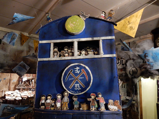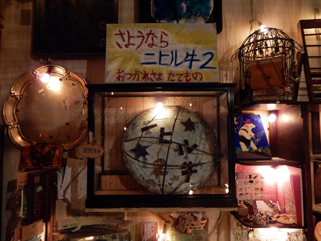 そのニヒル牛2最後を飾る展示は、ダンボール作家の山中奈緒子さんによる「炭坑の街」でしたが、期間中日々変化し続けて来た展示内容も、最終日を迎えて、 町の人々を載せた炭坑のトロッコ列車が、遂に天高く銀河鉄道のごとく、空を駆け昇り始めている光景が拡がっておりました。・°・。☆ 廃墟となった炭坑の 街並みは、寂しさの中にもどこか美しいものを感じました。・°・。(☆_☆)/ 閉店後まもなく、店主の石川あるさんをはじめ、ニヒル牛スタッフのみなさんによる合唱が披露されて、店に集まっていた大勢の作家さんや常連のお客さまの拍手喝采で、10年に渡るお店の歴史に幕が降ろされました。・°・。(´_`。) ニヒル牛2は閉店いたしましたが、ニヒル牛1の方は2016年1月一杯の改装期間を経て、2月1日より再び新装開店する予定です! わたくしもアトリエ☆イボヤギとして箱スペースを借りる予定ですので、ニヒル牛について引き続き皆さまのご愛顧を承りますよう、わたくしの方からもよろしくお願い申し上げます(^-^ゞ