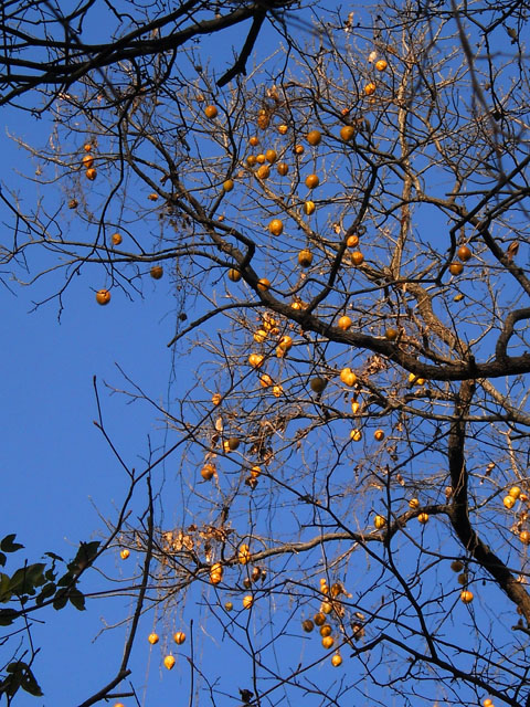 明るさを増した林の中ではまだ残っている木の実も目に付きました。ゴンズイの実の赤と黒のコントラストもよく目立ちました。高い樹の梢からはキカラスウリの実がたくさん下がっていて、それぞれの実のサイズも立派で、青空を背景に補色のイエローが際立って見えました。・°・。◯ 雑木林を囲むフェンスの上では、オニドコロの実がまるでモナカ色のハートを連ねた飾りのようにも見えました。・°・。*