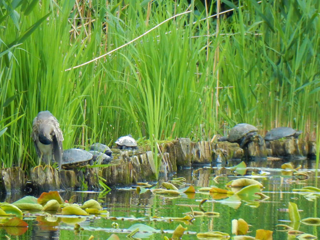 池の沖合にある島の葦原の周りの杭の上に、ゴイサギとたくさんの亀が並んでおりました。ゴイサギはまだ幼鳥の頃の「ホシゴイ」の模様が残っていて、ゆっくりとマイペースで羽繕いをしておりました。・°・。亀の種類はよく判りませんでしたが、おそらくミシシッピアカミミガメが多いように見受けられました。・°・。*
