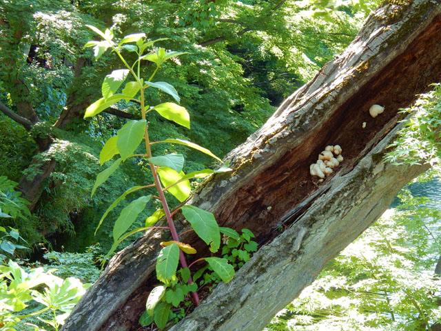 遅めのお昼は木陰のベンチに座って、近くで買って来たデリ弁当をいただきました。持参した冷たい麦茶を飲みながら上を見上げると・・・樹々の梢の隙間に偶然出来た、タツノオトシゴの形を発見しました。・°・。ヽ(´▽`)/ 池の方へしなだれかかった古木の胴に、ヨウシュヤマゴボウの苗が育っておりました。・°・。吉祥寺の街なかにある洋服の量販店の一角に、ミニ・井の頭自然文化園がございました。すぐ近くにある動物園の紹介と、キッズたちが楽しめるようなコーナと生き物絵本が揃っておりました。・°・。♪ アトリエ☆イボヤギ 木村大介