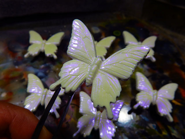 カラスアゲハの帯留めに、ノーマルカラーとは異なるカラーバリエーションをラインナップしておりますが、今回は以前制作してご好評だったラインナップを再生産いたしました。・°・。全体にツヤのある黒色を施したものや、ピンクメタリックにしたものなどです。上段の写真はその塗装工程です。・°・。☆