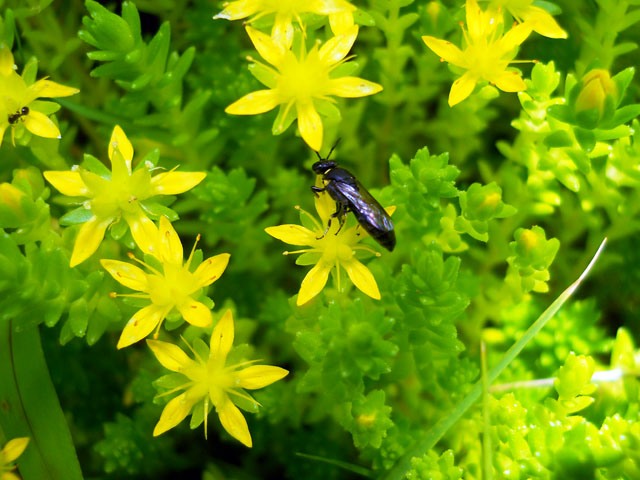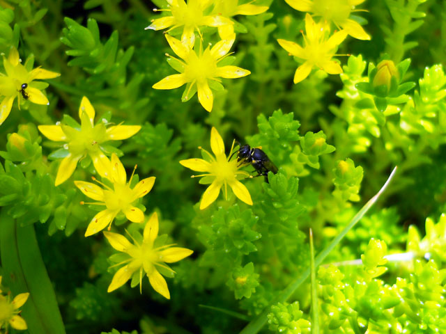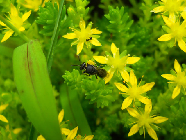 昨日の猛暑の中休みも束の間で、また猛烈な暑さが戻って参りました。。バナナが値引き処分でゲットできた時には、皮をむいてラップでひとつずつ包んで冷凍バナナにします。制作の合間に空腹と猛暑に耐え切れない時に、そのままかじるのも美味しいですが、朝はミルクで割ったヨーグルトに、ブラックベリージャムと共に入れると、冷たさが保たれてブラックベリーの強い酸味も和らげてくれて一石二鳥です。・°・。◎ 庭先に以前からマンネングサの仲間が生えていて、毎年この時期になると星のようなたくさんの花をにぎやかに咲かせます。外来種も含めてたくさんの種類があるようですが、ネットで調べてみたところ該当する写真が見当たりませんでした。。小さな花ですが近づいてじっくり観察してみると、小柄なハチやアリたちがしきりに花々を訪れていて、大変にぎわっていることが分かります。・°・。彼らにとってはステキな盛り場なのだと感じました。・°・。☆* アトリエ☆イボヤギ 木村大介
