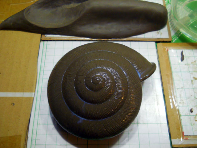 夏野菜の中でも、わたくしがいちばんよく食べているのはキュウリだと思いますが、今朝もチーズと一緒にパンに挟んでおいしくいただきました。・°・。塩もみにしたキュウリもご飯のお供にパリポリとよくいただいておりますが、よく冷やしたキュウリは夏バテ防止にもよいみたいで重宝しております。・°・。◎ 永らく掛かっていたデカ・マイマイの原型制作ですが、本日その殻パーツの方が完成いたしました。。仕上げは殻の成長過程を記録した年輪とも言える、細かい溝を刻んでいきましたが、微妙なカーブを描きながら線の幅が均等になるようにするのは、とてもバランス感覚の求められる困難な作業でした。。何度も刻んではまたならすことを繰り返しながら、ようやく完成した時には、猛暑も重なって気力と体力をだいぶ消耗しておりました・・・写真は仕上げ後にコーティング剤を塗布したところです。・°・。明日は奥に写っている軟体部を完成させる予定です。・°・。コンクリート舗装の上を黒豆がもそっもそっ..と小刻みに動いていたので、しゃがみこんでよく見ると、クロヤマアリがビロウドコガネさんの亡きがらを意気揚々と運んでいるところでした。。ビロウドコガネ好きなわたくしは、一生懸命に戦利品を運んでいるクロヤマアリさんに一言詫びて、手のひらに亡きがらを載せてしばし眺めてから、再び地面に戻しました。。いきなり獲物を取り上げられた、気の毒なクロヤマアリさんはどこかへ逃げてしまいましたが、また見つけに来て無事に巣に運ばれて、新しい生命に役立てられることを祈りました。・°・。● アトリエ☆イボヤギ 木村大介