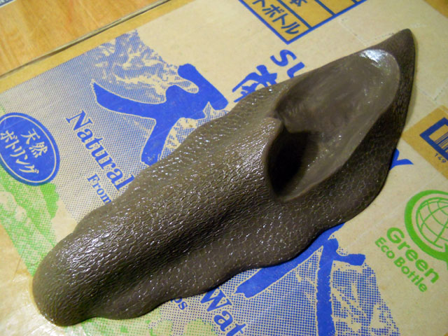 猛暑続きの中、特に陽当りのよい2階にある作業部屋は、日増しに過酷な環境になっておりましたが、とうとう38度を超えてしまいました。。しかも一時的ではなく、なかなか温度が下がらなくて、ハードさこの上ない状態が続きました。。(-_-;) それでも霧吹きとダブル扇風機の組み合わせで、気化熱を利用してかなりの涼感は得られているので、熱中症にはならずに乗り切れております。・°・。そんなアトリエ☆サウナの中でも、デカ・マイマイの原型制作は昨日の殻パーツに続いて、軟体部も無事に完成いたしました。触角と殻を外した状態を見ていると、なんとなく細長い靴のようにも見えて参りました。・°・。原型を載せているベースには、ミネラルウォーターの空きダンボールをもらい受けて、高透明梱包テープでコーティングしたモノを用いております。重たいボトルを入れるだけあって頑丈なので、大型作品を手掛ける際には重宝しております。・°・。一日の作業を終えて厳しい暑さに耐え抜いた後のスイカは、最高のご褒美となってとても甘く瑞々しく感じられました。・°・。◎ アトリエ☆イボヤギ 木村大介