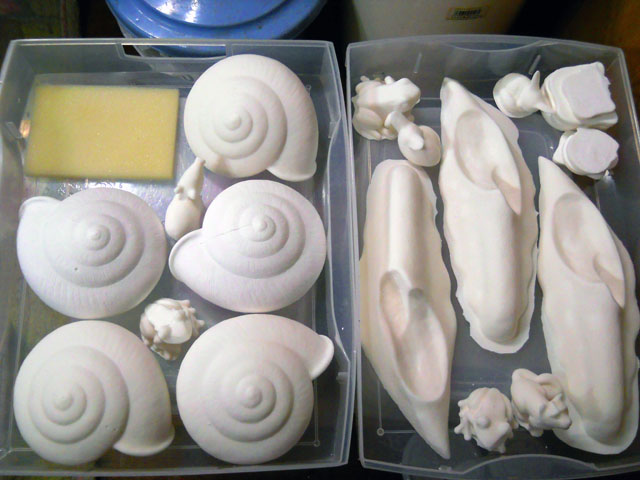 今年は拙宅周辺で、ササグモの姿をよく見かけるような気がいたします。写真は半日陰になった、プテリスシダの葉の上で見かけたメスのササグモさんですが、模様のきれいな腹部が少し大き目に見えたのは、もしかしたら卵を持っていたからなのかな?と思いました。・°・。◯ 昨日までに原型を完成させて、シリコーンによる型取りを終えたデカ・マイマイを、本日はいよいよ素材の注型作業を行いました。写真は型抜きしたものを並べたところです。原型よりも密度の高い硬質石膏素材なので、殻のパーツは手に持つとそのヘビー級なサイズから来る重量感をずっしりと感じました。・°・。また素材の白さからまるで海の貝か、化石のアンモナイトなどを連想してしまいます。。いっしょに注型作業を行ったカエルやユキヒョウたちと比べてみると、その巨大さがいっそう実感できます。・°・。*湯がいたホウレン草を水で冷やして絞りながら、そのおいしさについついつまみ食いをしてしまいます。。特に根の近くの甘味と歯応えが好きでたまりません。・°・。◎ アトリエ☆イボヤギ 木村大介