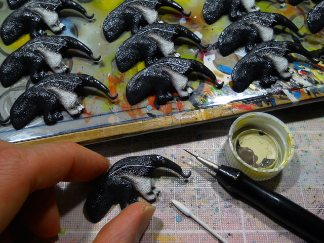 ひさしぶりに親族で集ったこの機会に、ブラザーシェフがクリームケーキをこさえてくれました。・°・。わたくしはスウィーツ好きですが特にクリーム系に目がありません。・°・。そこで今回はホイップクリームを特に多目にしたものをリクエストいたしました。・°・。ケーキのスポンジベースはテフロン鍋で焼いたものですが、とてもおいしく焼きあがっていて、夢のクリーム三昧を堪能させていただけました。・°・。◎ 食事の後はヒョウモントカゲモドキとたわむれたりして、よい時間を過ごしました。・°・。* そして帰宅後は再びブローチ作品の塗装作業へと戻りました。写真は先日、首元から走る白線を描き終えたオオアリクイたちに、眼の周囲と耳の中のマッドブラウン色を施しているところです。・°・。* アトリエ☆イボヤギ 木村大介