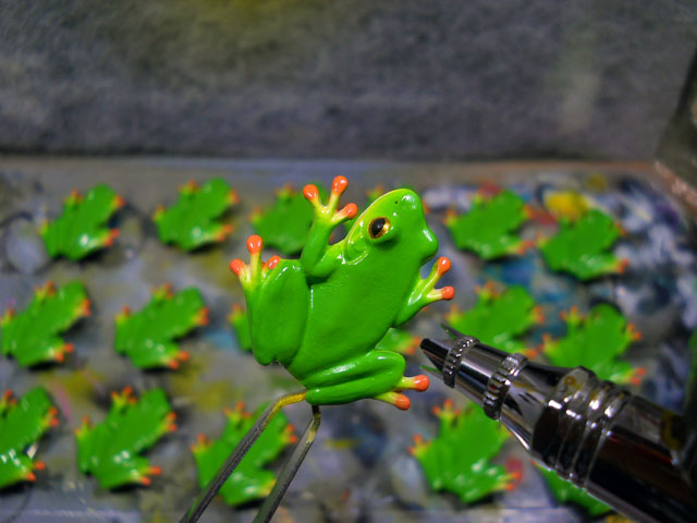 今日は朝から晩まで雨がよく降り続きました。・°・。春の雨は一雨ごとに暖かさも増してきますが、急に寒さが戻ったりもしますので、体調管理や身支度に油断ができません。・°・。* アパートの敷地の、踏み石の間で葉を拡げたオニノゲシのロゼット葉に、撥水効果で弾かれた水滴が、キラリと光って見えました。・°・。* 本日の外出は控えて二階のアトリエにこもって、ブローチ作品の塗装を進めました。・°・。写真は主だった塗装を終えたオキナワアオガエルに、クリアーイエローを全体に薄く吹き付けることで、生き活きとした色合いに仕上げているところです。・°・。◎ 先日の手打ちうどん体験でこさえた極太うどんを、今夜は肉汁うどんにしていただきました。長ネギをたっぷり入れ生姜も効かせて、大変美味しく温まりました。・°・。* アトリエ☆イボヤギ 木村大介