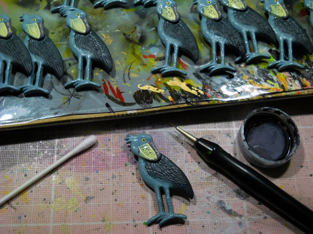 霜などの厳しい寒さに弱いプランツたちは、階段の踊り場の小さな窓辺で冬越しさせております。・°・。今日みたいに北風は厳しく陽射しには恵まれているような日には、日中は結構暖かくなります。・°・。ゼブリナたちも葉をいっぱいに広げて光合成活動に励まれているようでした。・°・。そしてわたくしは陽の当たらないアトリエの奥の方で凍えながら。。ブローチの塗装作業に勤しみました。・°・。写真はハシビロコウ・ブローチのクチバシの模様を描き込んでいるところです。・°・。ひとつ一つ異なる模様を施しております・・・と言いますかそのぉ。。全く同じには描けないだけとも言えますが。。(*_*)。・°・。値引き処分になっていたスナップエンドウを久しぶりにゲットいたしました。・°・。サッと湯がいて熱々に塩をまぶして「ぱきっ」と音を立てながらいただくのが大好きです。・°・。◎ アトリエ☆イボヤギ 木村大介