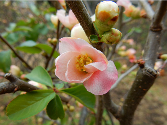 樹々の間を飛び渡る鳥を追いかけると、それは今シーズン初めてお目にかかるツグミさんでした(^^) 地面に舞い降りると、落ち葉の間をくちばしでつつき回しながら、夢中になってエサを探しておりました♪  不意にツグミさんが飛び立ったので何事かと思ったら、モズの雌に追い回されておりました・・・モズの方が体のサイズは半分ほどなのに、見た目のかわいらしさとは裏腹に、ずい分と荒々しいのだなと改めて感じました。・°・。(*゜0゜) 園内のボケの生垣にも、ちらほらと花が咲いておりました。・°・。その5へつづく・・・