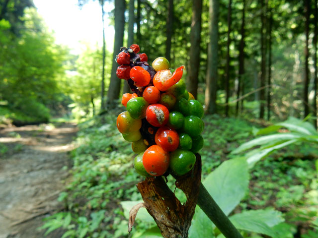 まもなく右手に広い水面が見えて来ました。農業用水の為に造られたという小篠貯水池でしたが、澄んだ青緑色の水が涼しげでした。・°・。木陰の道端に色とりどりのテンナンショウ属の実が成っておりました。・°・。道中にはこの山が大切な水源地となっていることを示す立て札もございました。・°・。*