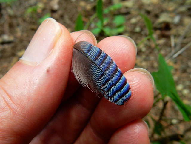 山道の斜面には真っ白いドクツルタケを結構見掛けました。その猛毒と白い容姿から死の天使とも呼ばれるそうですが、確かにそのような雰囲気を感じました(*゜0゜) 広葉樹の多い山道でしたが、アカマツやヒノキなどの生えた少し薄暗い針葉樹地帯を歩いていると、カケスの羽を拾いました。スポットライト的に差す木漏れ日の下で眺めると、水色から藍色のグラデーションがとても美しく見えました(*'-'*)