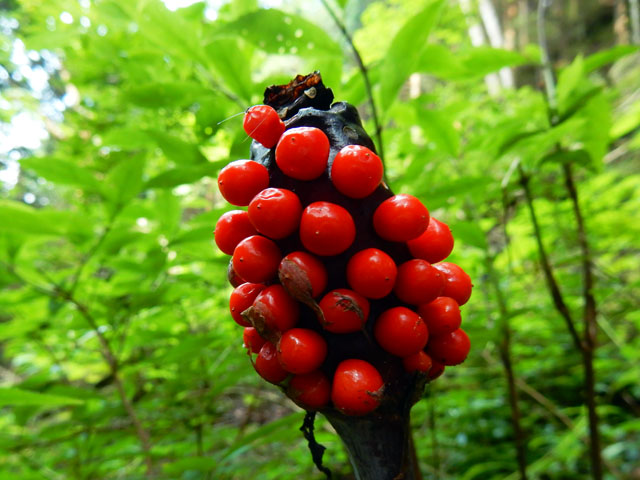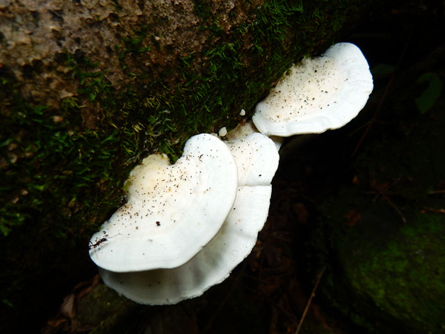 出発地点でも見かけたテンナンショウ属の実ですが、今度は全体が赤々とよく熟したのを見つけました。その鮮やかさは、谷間の仄暗い緑の世界ではかなり目立っておりました。・°・。倒木に沿って真っ白いサルノコシカケ科のキノコが生えておりました。写真を撮っていると、とてもスレンダーなアリが一匹現れて、白いキノコの上を探検し始めました。・°・。*