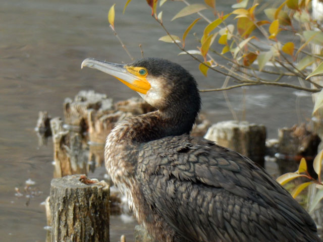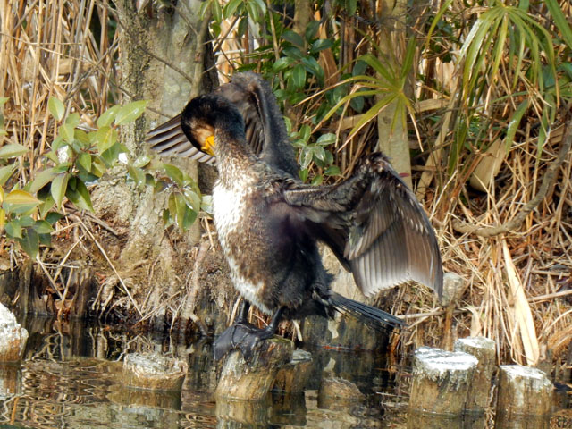 陽のよく当たる杭の上では、カワウさんが羽を拡げて乾かしながら、羽繕いをしておりました。望遠レンズでしばらく撮影していたら、レンズ越しに目が合いました(・・;) カワウさんのエメラルドグリーンの眼がとても美しくてすてきです。。。