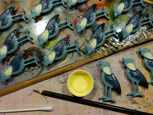 今日もよく晴れて乾燥した冬晴れのお天気になりました。・°・。地面も乾いているので風が強いと砂ぼこりも舞ってしまって困ります。・°・。(>_<) 最初の写真は定番アイテムの一つである、ハシビロコウ・ブローチの塗装の様子です。くちばしの紫色の斑紋を描き込んだ上に、薄く溶いたアイボリー色を重ねているところです。・°・。普段くじ運の低いわたくしですが、お年玉付き年賀葉書の切手シートだけは毎年数枚いただいております(^^) 今年も当選番号の御年賀状を下さった遠方の友人知人に感謝の念をお送りさせていただきました。・°・。(^-^ゞ  今宵はまだ青さの残る空に、少し霞がかってうすぼんやりとしたお月様が美しく観えました。・°・。〇  2017/02/07(火) アトリエ☆イボヤギ 木村大介