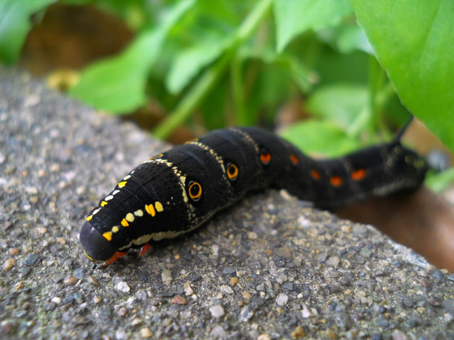 今日は一日まとまった雨が降り続きましたが、キンモクセイの強く香る中を都心まで納品に向かいました。・°・。しっとりと雨に濡れたキンモクセイは、香りだけでなく風情も一層感じられてすてきです。・°・。* 素材の買い出しなどを済ませた後、ニヒル牛2に立ち寄りました。そう言えば先週の晴れた日に、お店の脇でクリスマス展の準備をしていたスタッフさんに、変わったイモムシがいると聞いて手にとって見ると、それは小さなスズメガの幼虫でした。詳しい種類は判りませんでしたが、身体はまだ小さくても尾角だけは異様に長くて立派でございました。。指先で潰さないようにそっと摘み上げると、必死に抵抗して尾角を剣のように振り回しました。・°・。写真を撮った後は速やかに元いた場所に戻して差し上げました。・°・。*