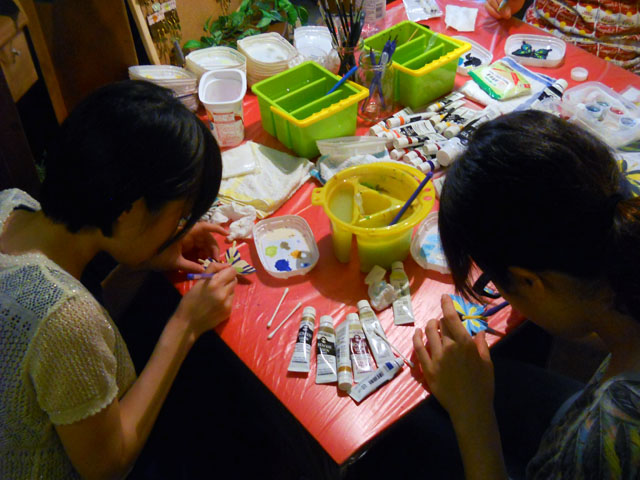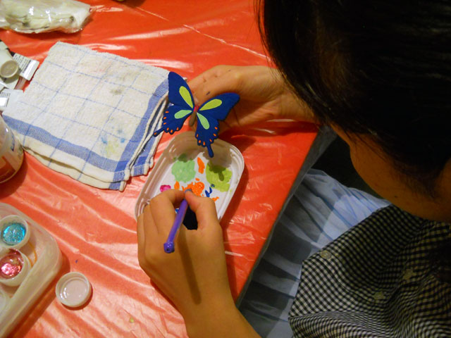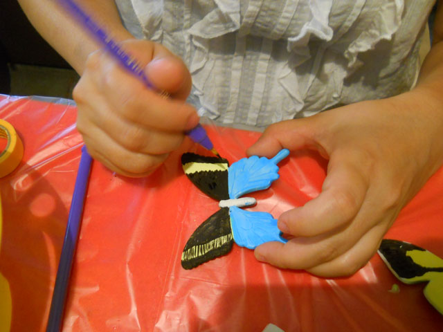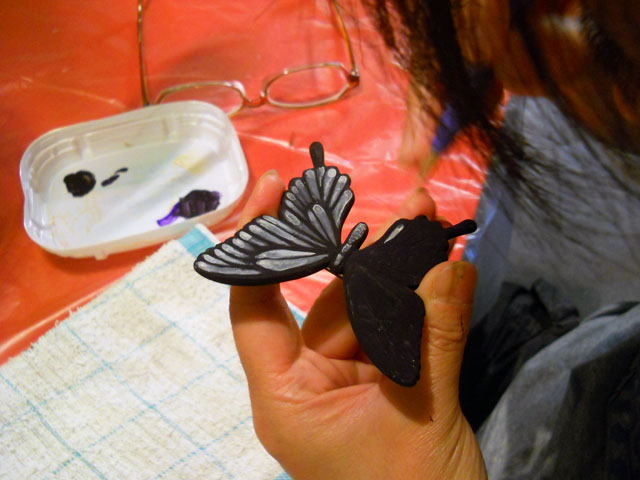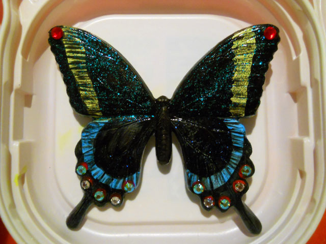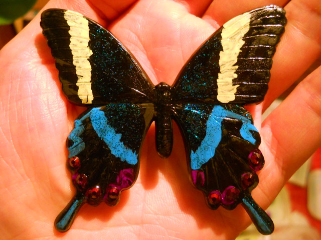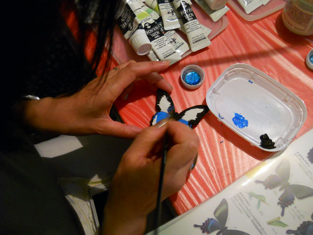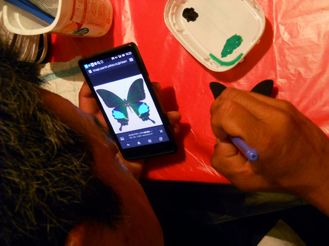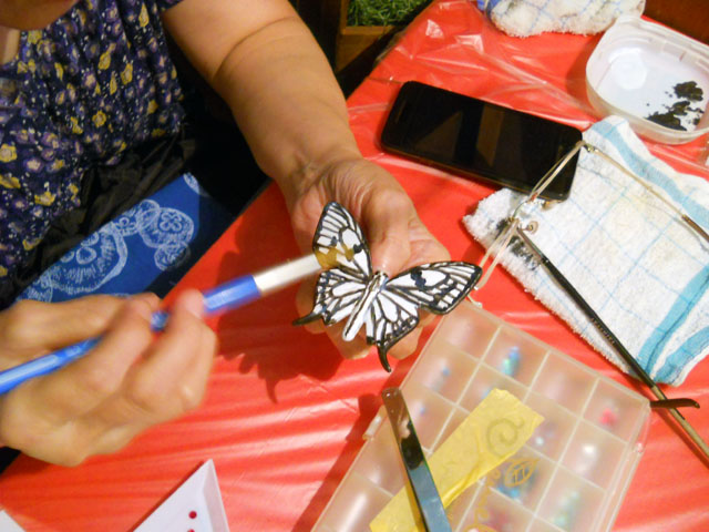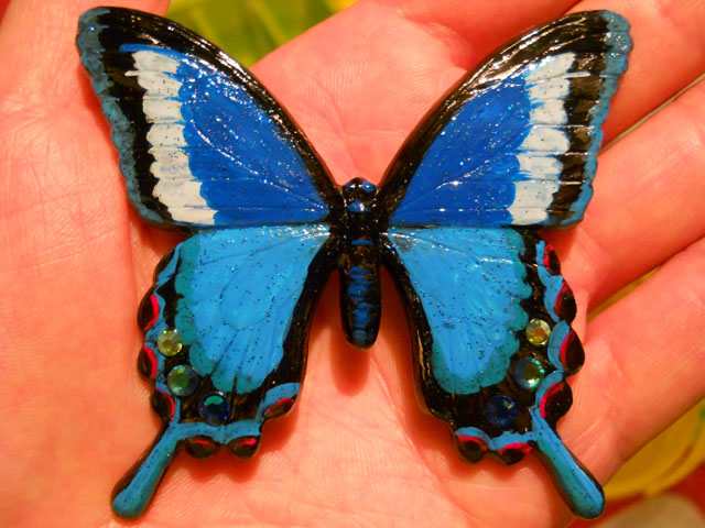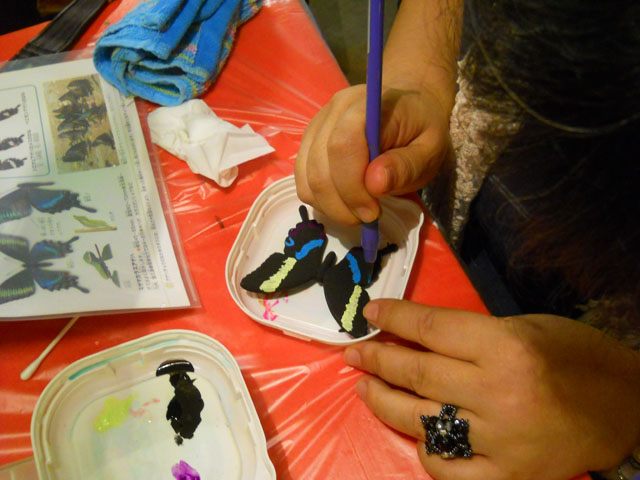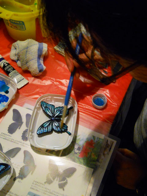 今回ご用意した素材は、カラスアゲハとゴクラクトリバネアゲハという二種類の蝶をモチーフにしております。カラスアゲハの方はほぼ実物大のサイズです。 始めにアクリル絵の具で色を塗ってから、お好みによりラメラメのパウダーを施したり、ラインストーンを貼り付けたりして仕上げますが、本来の色に近い彩色 を施す方や、全くのオリジナルカラーで自由にデザインされるパターンなど、それぞれに個性あふれる素晴らしい作品になりました(^-'*)♪ アトリエ☆イボヤギ 木村大介