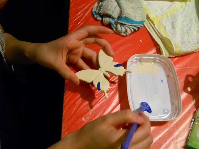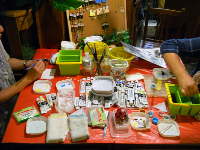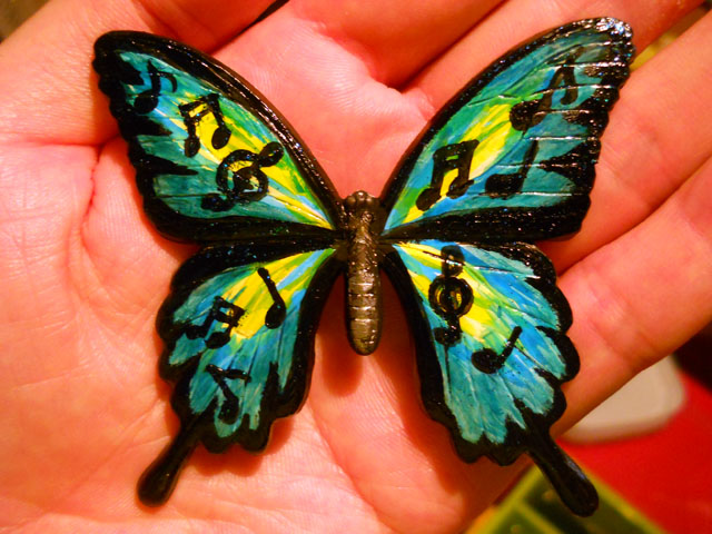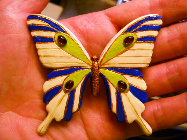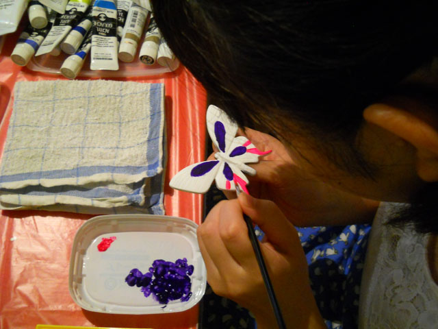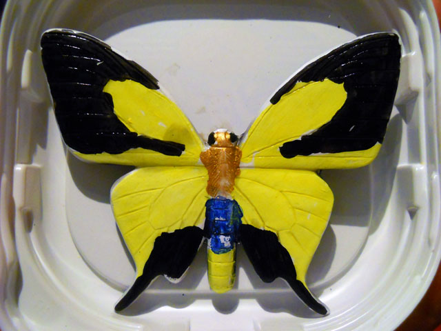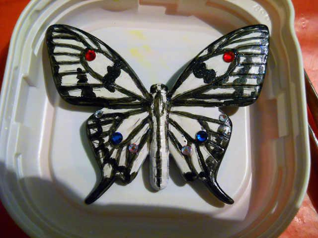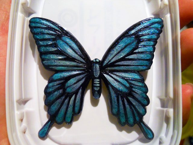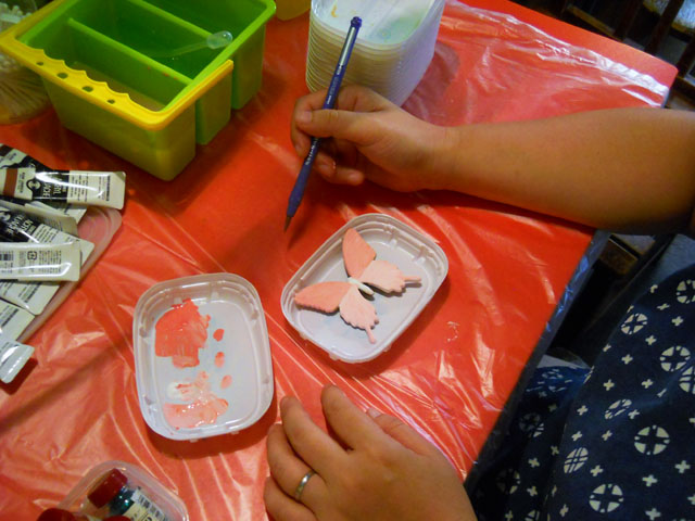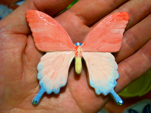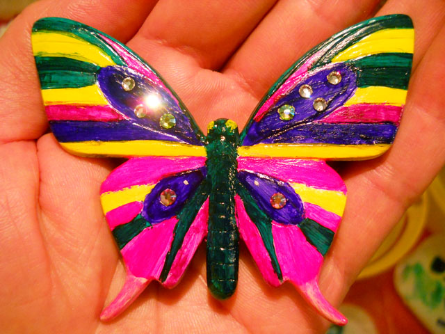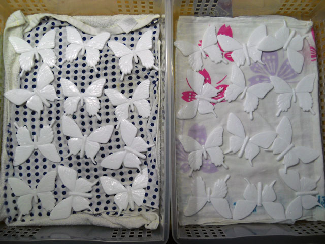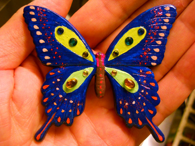 今回ご用意した素材は、カラスアゲハとゴクラクトリバネアゲハという二種類の蝶をモチーフにしております。カラスアゲハの方はほぼ実物大のサイズです。 始めにアクリル絵の具で色を塗ってから、お好みによりラメラメのパウダーを施したり、ラインストーンを貼り付けたりして仕上げますが、本来の色に近い彩色 を施す方や、全くのオリジナルカラーで自由にデザインされるパターンなど、それぞれに個性あふれる素晴らしい作品になりました(^-'*)♪ アトリエ☆イボヤギ 木村大介