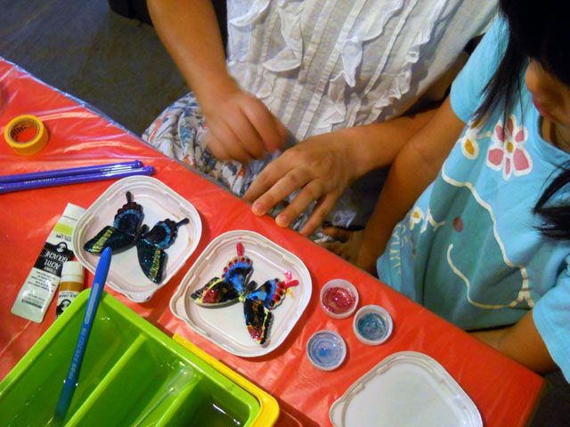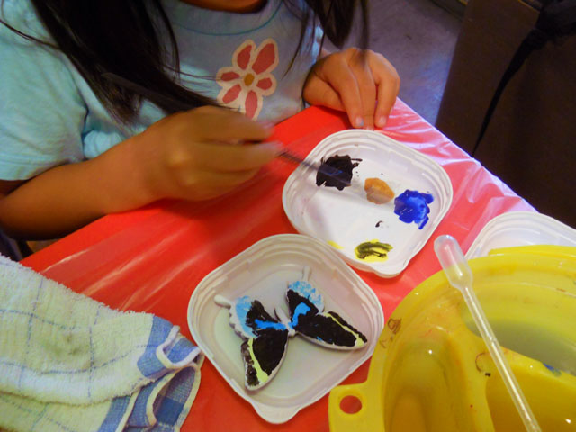 今年の「むし展」ワークショップ「デコって蝶大!ブローチペイント」の素材の方も、無事に完成して(何とかギリギリ・・(>_<);!)今日 の第一日目を迎えることが出来ました。お暑い中ご参加いただいた皆さまには、たいへんステキなセンスで大判ブローチを仕上げていただき、鱗翅目彩色指導員 といたしましても、かえってみなさまから学ばせていただけたような。。刺激的な一日となりました。・°・。(≧▽≦)!