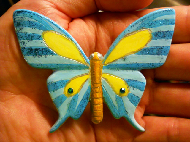 今回ご用意した素材は、カラスアゲハとゴクラクトリバネアゲハという二種類の蝶をモチーフにしております。カラスアゲハの方はほぼ実物大のサイズです。  始めにアクリル絵の具で色を塗ってから、お好みによりラメラメのパウダーを施したり、ラインストーンを貼り付けたりして仕上げますが、本来の色に近い彩色 を施す方や、全くのオリジナルカラーで自由にデザインされるパターンなど、それぞれに個性あふれる素晴らしい作品になりました(^-'*)♪   アトリエ☆イボヤギ 木村大介