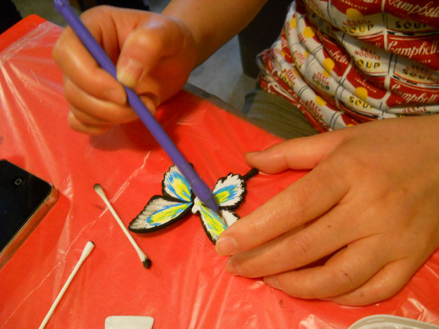本日は「第8回・むし展」ワークショップ「デコって蝶大!ブローチペイント」の第二日目が開催されました。左端の画像はお客さまの来られる前に、店主の石 川あるさんがペイントに挑まれている様子です♪ ベビーピンクをベースにしたパステル調で整えて、手早くパパッとステキに仕上げられておりまし た。・°・。