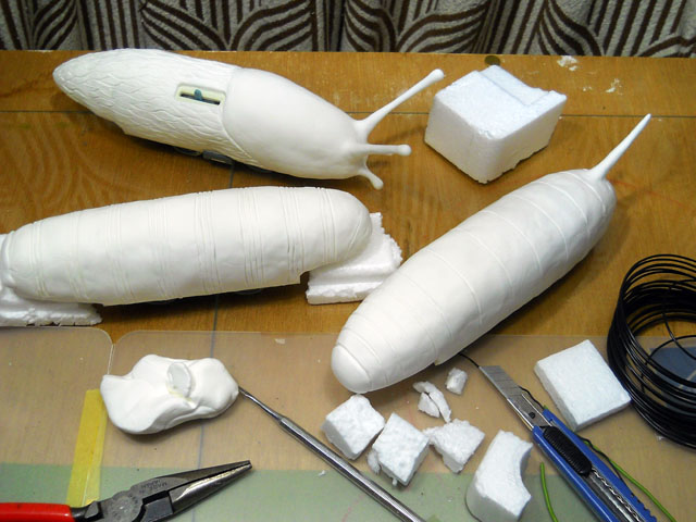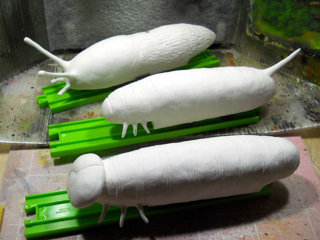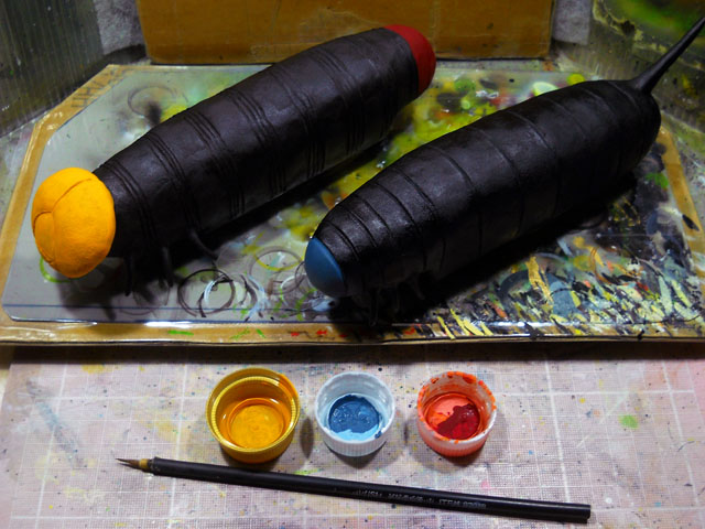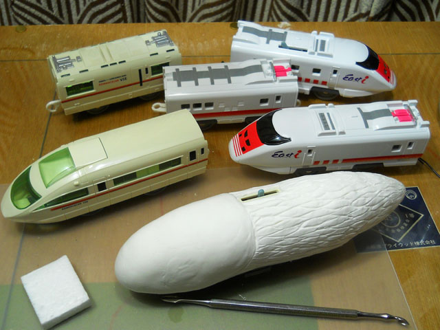 デカ・マイマイの素材の乾燥を待つ間に、虫々トレイン(チューチュー・トレイン)の製造に着手いたしました。・°・。今回ベースに選んだのは、鉄道模型玩具のプラレールです。流線型の特急列車の上から、発泡スチロールと軽量粘土を組み合わせて、それぞれの虫モチーフを形作って参りました。・°・。こう暑いと食欲も低下気味ですが、麺類は別腹でも入るほど好きなので、冷たく締めたそうめんで昼食は手早く済ませて、再び鉄道事業へと戻りました。・°・。右端の画像はまだ色も付いていない途上ですが、どの虫をモデルにしているかお分かりになりますでしょうか。。?! 当イボヤギ電鉄の虫々トレイン路線は、「むし展」ニヒル牛2会場で開業する予定です。・°・。皆さまのご乗車をお待ちしております♪※車両の安全運行の為、体重制限がございます。誠に恐れ入りますが体重が50mgを超える方は、社内規程によりご乗車いただくことが出来ませんので予めご了承願います。。m(_ _)m アトリエ☆イボヤギ 木村大介