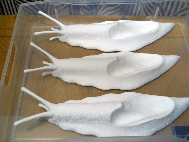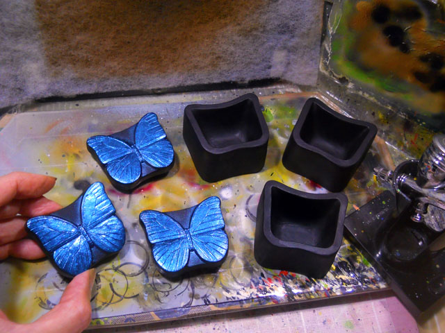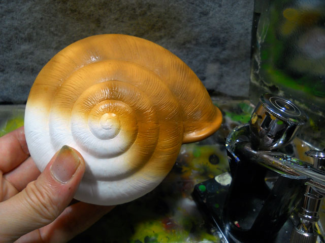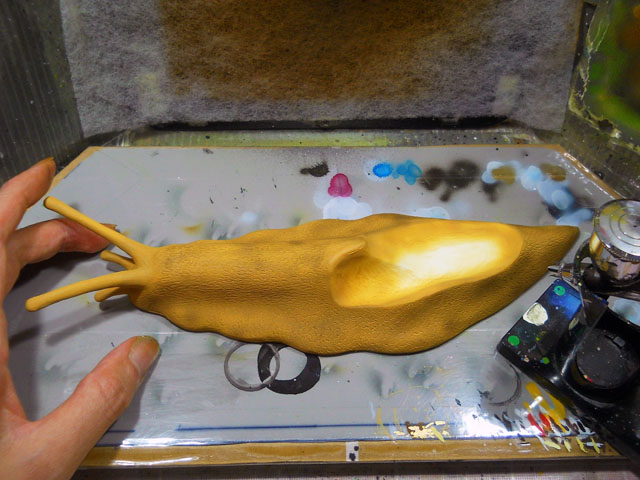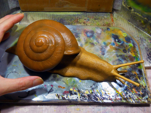 カタツムリらしいその鈍足によって、長い長い道のりを辿って参りました「デカ・マイマイ」プロジェクトでしたが、いよいよその塗装も進んで、これまで別々に制作してきた殻パーツと軟体部を無事に組み合わせることが出来ました。・°・。それぞれのパーツがピッタリと噛み合って、巨大なカタツムリの姿になった瞬間は、これまでに流した大量の汗(文字通りいったい何リットルになったのかと思う程の…)と労苦が報われた一瞬でした。・°・。(T ^ T)! その他の新作としては、昨年のワークショップの素材として制作した、「むし小箱」に今回は初めて塗装を施した作品も完成させました。写真はモルフォ蝶モチーフのものですが、他に「マイマイ小箱」という作品もございます♪ 明日は「むし展」第一会場のニヒル牛1の搬入日ですが、今夜はその為の仕度を整えました。・°・。◎ アトリエ☆イボヤギ 木村大介