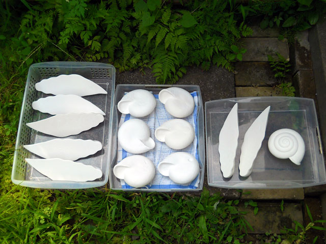今年は拙宅周辺で、ササグモの姿をよく見かけるような気がいたします。写真は半日陰になった、プテリスシダの葉の上で見かけたメスのササグモさんですが、模様のきれいな腹部が少し大き目に見えたのは、もしかしたら卵を持っていたからなのかな?と思いました。・°・。◯ 昨日までに原型を完成させて、シリコーンによる型取りを終えたデカ・マイマイを、本日はいよいよ素材の注型作業を行いました。写真は型抜きしたものを並べたところです。原型よりも密度の高い硬質石膏素材なので、殻のパーツは手に持つとそのヘビー級なサイズから来る重量感をずっしりと感じました。・°・。また素材の白さからまるで海の貝か、化石のアンモナイトなどを連想してしまいます。。いっしょに注型作業を行ったカエルやユキヒョウたちと比べてみると、その巨大さがいっそう実感できます。・°・。*湯がいたホウレン草を水で冷やして絞りながら、そのおいしさについついつまみ食いをしてしまいます。。特に根の近くの甘味と歯応えが好きでたまりません。・°・。◎ アトリエ☆イボヤギ 木村大介