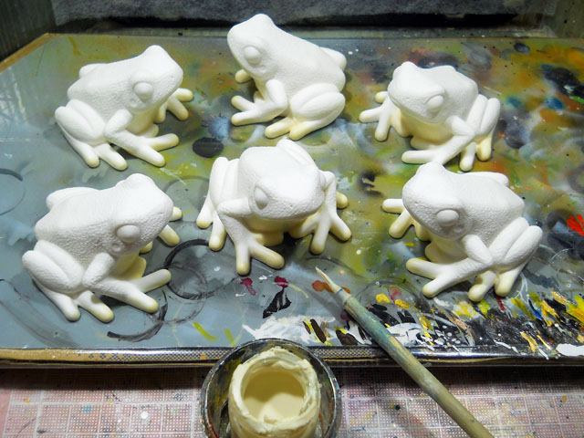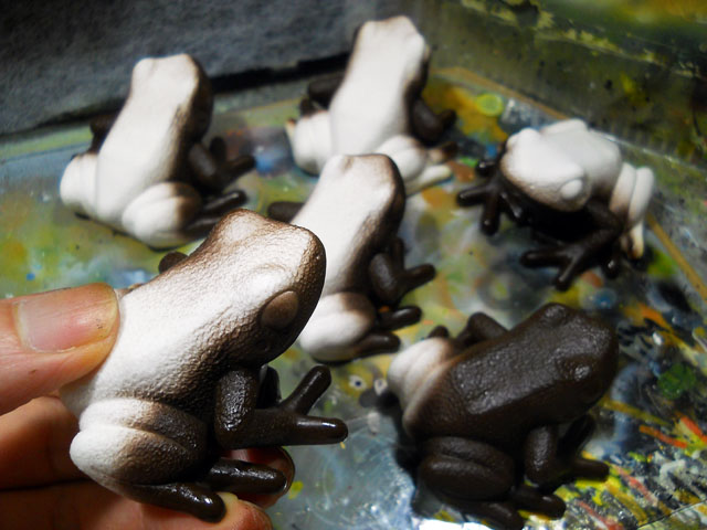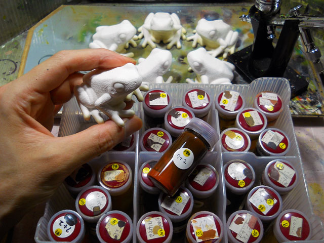 今日も朝から猛暑の予報が出されておりましたので、朝食をガッツリ食べて暑さに備えました。・°・。今朝は真っ赤なトマトをスライスチーズの上に並べて、マヨネーズをぐるぐるトッピングしていただきました◎ 新作のミステリオサスヤドクガエルはいよいよペイントに入りました。写真は参考写真を見ながら、これまで調合して来た手持ちのオリジナルカラーストックの中から、一番近い色を合わせているところです。ストックの中に適した色がない場合は新たに調色しますが、今回は無事に適合しました。色を塗り始めると。。まるでビターチョコレートのように見えて参りました。・°・。n('~')n 2階にあるアトリエではミニ扇風機を使い始めておりましたが、1階の大型扇風機も押入れから出して使い始めました。・°・。グリーンカーテンを通った風は植物の蒸散作用も手伝ってやはり快適なようです。・°・。見た目にも緑の光に涼を感じております。・°・。ところでそのグリーンカーテンの大敵の、ホオズキカメムシが今年もその数を増やしており、チュウチュウとツルから養分を吸い続けているので、昨年のようにプランターひとつ分を全滅させられないかと気に病んでおります。。たまに葉をめくって琥珀色に輝く美しい卵を発見したら。。なんだかかわいそうで気が咎めますが・・目をつぶって早目に間引かせていただいております。・°・。* アトリエ☆イボヤギ 木村大介