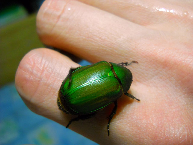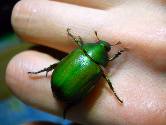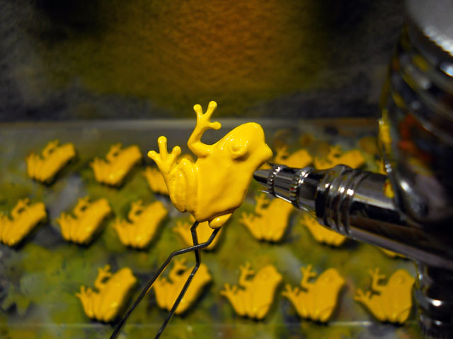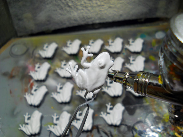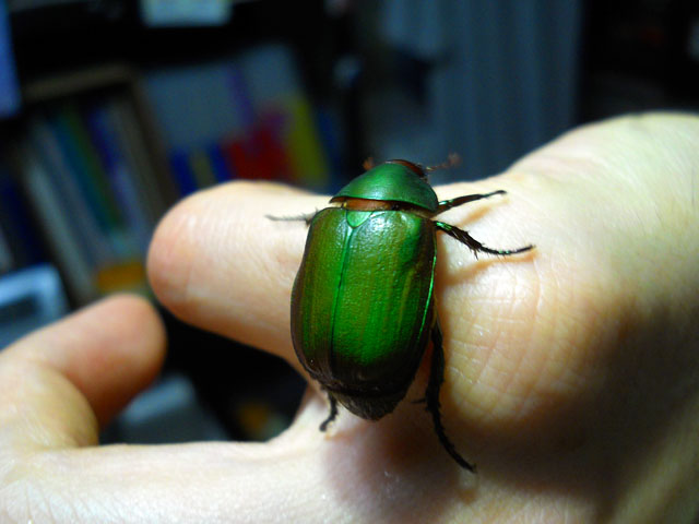 朝方よく晴れて雨の心配も少ない予報でしたので、安心してランドリーを外干しいたしました。・°・。気温も上がって久しぶりに蒸し暑さを感じる日になりました。・°・。ブローチ作品の塗装作業は、乾燥時間も早くなってはかどりました。写真はモウドクフキヤガエルの、ひまわりの花びらのようなビビッド・イエローを吹き付けているところです。・°・。* 昨夜のジョギングから戻った時、玄関脇の縁台に置いている、バケツの水面がゆらゆらと動いているのに気が付きました。・°・。薄暗さでよく見えなかったので外灯を点けて見ますと。。それは緑色の金属光沢が美しいアオドウガネさんでした。・°・。手を差し伸べて水から救い出すと、ホッと安堵したのかわたくしの手の上に青い糞をされました。。しばらくの間、身体についた水滴を後ろ脚で器用に拭っている姿が、なんだか滑稽でかわいらしく思へました。・°・。(^-'*) 身体が乾いてくると動きも活発になって来て、部屋の中で飛び始めたので、玄関を開けて夜の闇へと放ちました。・°・。☆ アトリエ☆イボヤギ 木村大介