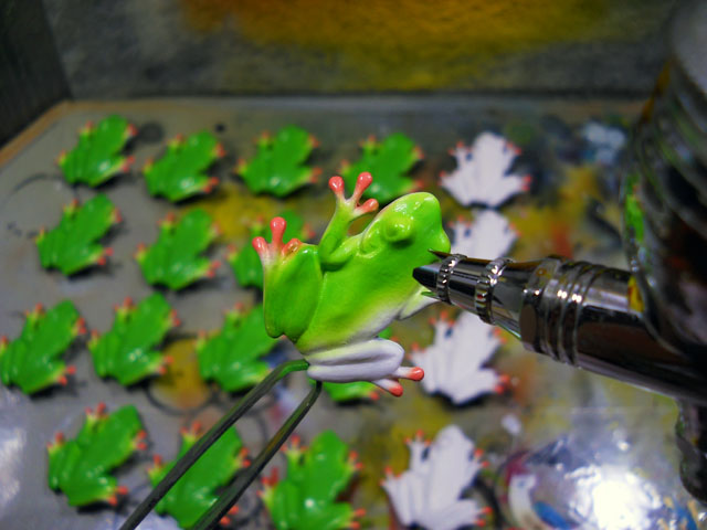 本日も蒸し暑さが増して、扇風機の稼働時間も長くなりました。・°・。ブローチの塗装はだいぶ色付いて参りました。写真はオキナワアオガエルのボディカラーを吹き付けているところです。色ムラが出ないように薄めに溶いた塗料で、少しずつ重ねてゆきます。・°・。アパートの向かいにある細長い緑地公園で、朝から不吉な機械音が響いて来て、地震かと思う程の激しい地響きが断続的に聞こえて参りました。。あとで買い物に出た時に見たのは・・・わたくしの大好きだった、大カエデの大木が無残にも根本から伐採された跡でした。。(´_`。) ついこの間にも、何の落ち度もない公園の大木が美観保持などという、大義不明の理由から次々と切り倒されたばかりだっただけに、本当にショッキングな出来事でした。。。(*_*)。・°・。近所にあるパンジーの花壇のそばの壁の上に、ツマグロヒョウモンの蛹が付いておりました。すぐ下にあるパンジーの葉を食べてすくすくと育ち、壁を伝って無事蛹になったようです。・°・。今年初めてのスイカを安くゲット出来ました。最近の食べ方は、種ごとバリバリといただいておりますが、わたくしにとっての初物スイカは、よく熟していて甘くておいしゅうございました。・°・。◎ アトリエ☆イボヤギ 木村大介