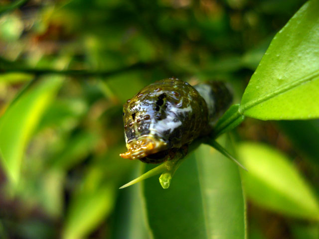 朝から弱い雨が降ったり止んだりを繰り返しながら、気温の方は夏日に届きました。・°・。アメリカンチェリーを安くゲットしたので、食後に摘みながらビタミンCを補充しました。・°・。新作・ミステリオサスヤドクガエルの原型制作の方は、ようやく全体のフォルムが整ってきて、鼓膜と鼻の穴の位置を確定出来ました。・°・。裏庭の夏みかんから採取した種から育てている、苗木に今年もナミアゲハの幼虫が育っております。・°・。写真は4齡幼虫ですが、あまりのツヤッ艶&照りテリ感で、見事な鳥の糞擬態にいたく感心いたしました。。まるで落としたてほやほやの鳥の糞そのモノのようでした。・°・。◎ 頭部にあるつぶつぶがまるで王蟲の目玉のようでもあり、見る角度によっては近代的な新幹線のフォルムにも見えました。・°・。新柑線アゲハ号といったところでしょうか。・°・。? アトリエ☆イボヤギ 木村大介