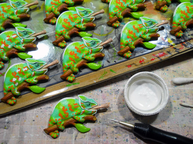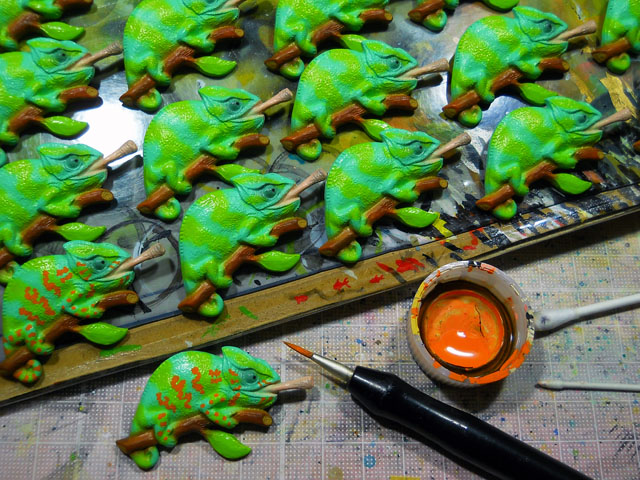 朝からまぶしい陽射しが降り注いでぐんぐん気温が上がってゆきましたが、湿度が低いのでさらっとして割りと過ごしやすい陽気でございました。・°・。◎ 高温かつ乾燥しているので、塗料の乾きも早まって、筆塗り作業も効率よく運びました。・°・。写真はエボシカメレオンのオレンジ色の模様を描き込んでいるところです。結構ビビッドな色なので、長く作業を続けていると。。しばらくオレンジ色の残像が目に焼き付いております。・°・。* 今日は語呂合わせで6月4日=虫の日あるいは虫歯予防の日らしいですが、虫好きといたしましてはもちろん「虫の日」として認識しております♪ ハルジオンの花にカツオブシムシが、風に吹き飛ばされないように、しっかりとつかまっておりました。・°・。幼虫時代は衣類など繊維質を食害する害虫として知られていて、その貪食を活用して脊椎動物の骨格標本作りにも利用されるほどですが、成虫は花の蜜を好むそうで、よく花の上などで見かけます。・°・。おとなになると団子より花なんですね。・°・。♪ うちのアパートの裏庭の夏みかんは、かなり大きな実がなりますが、先日収穫した中にとりわけ巨大なのがございました。。わたくし結構手の平が大きい方だと思うのですが、載せてみたらなんだか子供の手のように見えた程です。。重さを量ったら675グラムありましたが、皮をむいたら約半分の重さになりました。。かなり分厚い皮に守られていることを実感いたしました。・°・。◎ アトリエ☆イボヤギ 木村大介