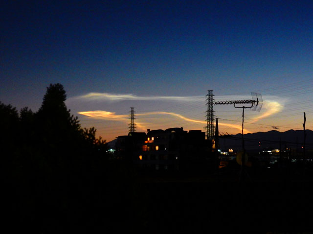 今朝の冷え込みはまた格別で、当地ではマイナス3.6度とのことで、縁台に置いたバケツの水が、厚めの氷を張りました。・°・。◎ 防寒対策を万全にして、暖房のないアトリエでの作業に励みました(塗装などで有機溶剤を用いる為、常に換気扇を回しているので、あえて冷暖房なしにしております・・・)。図書館に行った帰り、市営グラウンドのケヤキや桜の樹々が、トライライトブルーの空に美しく映えておりました。・°・。近所のスーパーに買い出しに行った帰り道、いつもの富士見スポットで不思議な光景に目が留まりました(*゜0゜)! まるでオーロラのような奇妙な帯形の明るい雲が、少しずつ形を変えながら輝いておりました。・°・。後でSNSを見ていて知ったのですが、この日に打ち上げられたH-IIAロケットによるものではないかとのことでした。・°・。それにしてもなんというグッドタイミングで、こんなにもステキな天空ショー?を観られたのかと感激いたしました。・°・。(≧▽≦) 2017/01/24(火) アトリエ☆イボヤギ 木村大介 〈本日のタイトル解説:『 ロケットの たなびく雲に 星ロマン。・°・。☆ 』〉 ※昨年2016年9月末に小生パソコンの故障により、長らく当ブログの更新が滞っておりましたが、幸いにもデータの部分的復旧が叶いましたので、休載期間中の記事に付きましても、これから徐々にアップさせていただきたいと存じております。*ただ・・・失われた画像データのほとんどのファイル名が、復旧後に判読不可能な記号に置き換わってしまっております為、過去の記事に付きましては、判読可能な分から順不同にて掲載させていただくことになりますので、お見苦しい点が多々ございますが、何卒よろしくお願い申し上げます(-_-;)