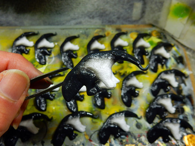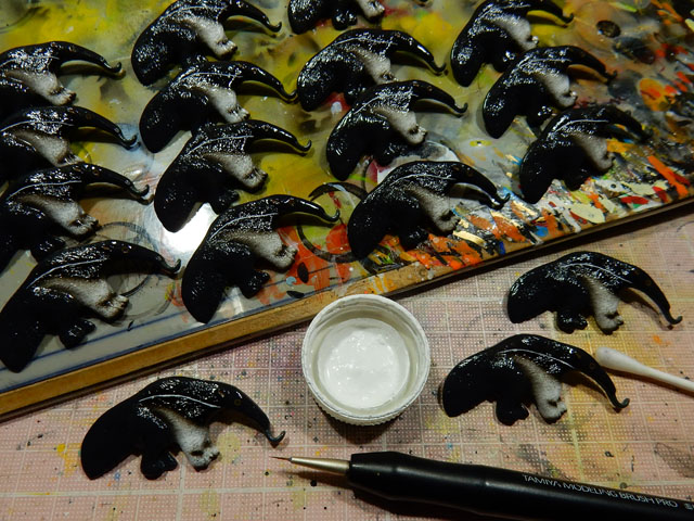 最近ホームベーカリーの調子がよくないので、たくさん値引きゲットしたバナナを用いて、朝食にパンケーキをこさえております。薄くスライスした一本分のバナナと大好きなレーズンもたっぷり入れて・・・焼き立てにマーガリンとハチミツをかけて、熱々のほっくほくをおいしくいただいております(o^-^o)♪  ブローチの制作の方はエアブラシ塗装をほぼ終えて、手描きの作業に移りました。3番目の写真はオオアリクイさんの首元から腰辺りにかけての白いラインを描き入れているところです。微妙な曲線を慎重に引いてゆきました。・°・。2017/01/26(木) アトリエ☆イボヤギ 木村大介 〈本日のタイトル解説:『 パンケーキ 薄切りバナナで ほっくほく。・°・。(o^-^o) 』〉 ※昨年2016年9月末に小生パソコンの故障により、長らく当ブログの更新が滞っておりましたが、幸いにもデータの部分的復旧が叶いましたので、休載期間中の記事に付きましても、これから徐々にアップさせていただきたいと存じております。*ただ・・・失われた画像データのほとんどのファイル名が、復旧後に判読不可能な記号に置き換わってしまっております為、過去の記事に付きましては、判読可能な分から順不同にて掲載させていただくことになりますので、お見苦しい点が多々ございますが、何卒よろしくお願い申し上げます(-_-;)