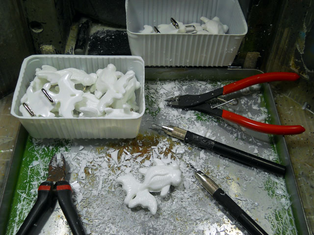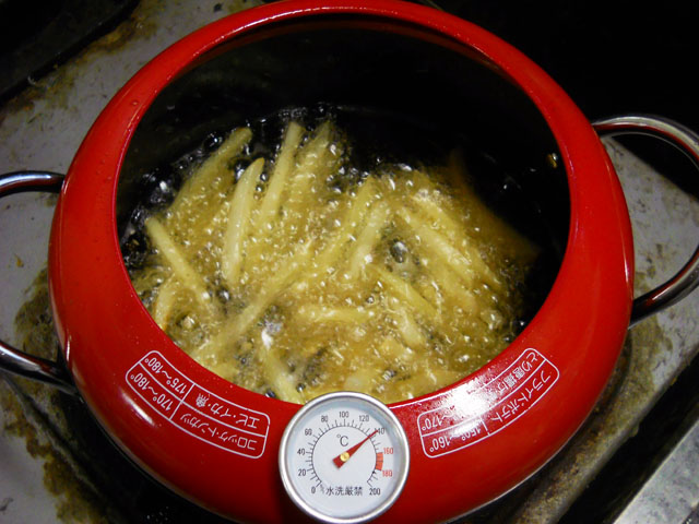 最近揚げ物の頻度が高くなったので、天ぷら鍋を購入いたしました。・°・。油ハネが少ない構造になっているなど使い勝手が良くて、もっと早く買えばよかったと思っております。。(備え付けの温度計が低い温度を指しているのは、油の量が少なめなので、油面が温度計の先端に達していないためです)。朝からフレンチフライポテトを揚げて。。ガッツリとカロリーを摂取して、一日の仕事に気合を入れて取り掛かりました。・°・。本日も帯留め作品のバリ取り作業を続けました。。先日と同じ写真に見えますが、デメキンはなかなか手間のかかるアイテムなもので・・結構時間が掛かっております。。カットしたバリの削りカスの量が時間の経過を物語っております。・°・。朝方雨が少し降ったものの。。あまり地面を潤すことなく、間もなくやんでしまい、再び五月晴れの汗ばむ陽気となりました。・°・。いつもの緑地公園で大きなガガンボを見かけました。・°・。黄色い頭胸部に黒い縞模様のある、なかなかオシャレなデザインでしたが、後で調べてキイロホソガガンボというお名前だと知りました。・°・。成虫は花の蜜を吸うそうですが、幼虫は植物の根などを食べるそうで、麦の害虫の疑惑が掛けられることもあるとのことでした。・°・。* アトリエ☆イボヤギ 木村大介