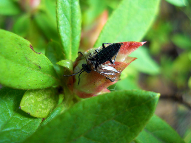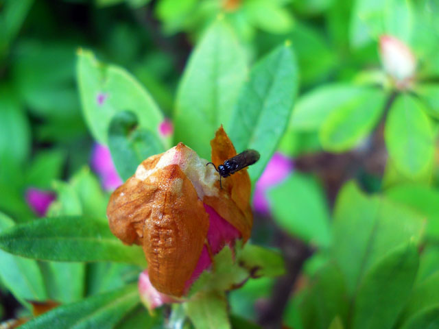 朝から曇りがちのお天気でしたが、夜になって久しぶりのまとまった雨が降り出しました。・°・。これですっかり乾いてしまっていた大地も、しっかりと潤いそうです。・°・。◎ 先日からリポートしてきた、様々な虫たちに人気のオオムラサキツツジの生け垣ですが(今までサツキと書いておりましたが・・)、実は不思議な光景を見て気になっておりました。。まだ堅い蕾の外側を覆っている萼(がく)や蕾の上に、どうやら何か粘着性のある物質が分泌されていようで、小さな虫たちがいくつも貼り付いておりました。。中にはまだ動いていて、脚を突っ張って身体をなんとか引き剥がそうと、懸命にもがいているのもおりました。。。インターネットで調べてみても、花を食べる虫の食害からツツジが身を守るための手段ではないか・・?とありましたが、確証はないようでした・・・次々と鮮やかな赤紫色の美しい花を咲かせているそばで、なんとも恐ろしい虫たちの墓場が累々と拡がっている光景に、自然界の(オオムラサキツツジは交配種だそうですが、他の種類のツツジにも同様のネバネバトラップがあるようです)サバイバルの厳しさも垣間見た気がいたしました。・°・。* アトリエ☆イボヤギ 木村大介