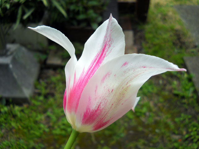 今日は朝からよく晴れましたが、風がとても強く吹き荒れて洗濯物はあっという間にスッキリと乾いてくれました。・°・。白地に桃色の絞りが入ったチューリップが、風に負けじとがんばって咲き出しました。・°・。フェネック・ブローチの研磨作業に入りました。これは素材表面に微細な溝を付けることで、塗料がしっかりと活着するために行う大切な工程です。・°・。力を入れ過ぎるとすぐに肩や肘・手首を痛めてしまうので、適度な力加減が肝要です。・°・。春の多摩ZOOリポート・その10をお届けいたします。・°・。大温室の出口に近い側の観覧通路で、ハイビスカスの葉先に留まった少し大柄のトンボが、こちらを見ていることに気が付きました。・°・。温室の中では小さなイトトンボはよく見かけましたが、これだけ目立つサイズのは初めてで、ひょっこりと現れたような感じでした。・°・。透明な羽を透かして背景の緑がきれいに見えます。。あとで名前を調べてみたところオオシオカラトンボの雌だと判りました。・°・。背面の黄色も鮮やかできれいなトンボでした。・°・。アトリエ☆イボヤギ 木村大介
