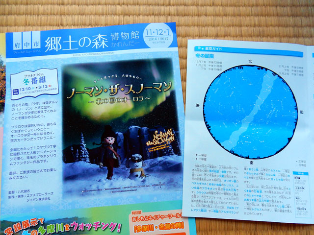 郷土の森博物館では、プラネタリウムの新番組「ノーマン・ザ・スノーマン」を観て参りました。日本製のストップモーションアニメで、街に住む少年が親友の雪だるまと共に、北の国へ冒険に出るというストーリーでした。映像も素晴らしかったですが、物語の内容もステキなお話しでした(*^ - ^*) 会場には実際に撮影に使われたセットの一部も展示されていて、訪れた人たちも興味深く覗き込んでおりました。・°・。☆彡 〈本日のタイトル解説:『雲間から 雄姿覗かす 黄昏に。・°・。~△~~』〉 2017/01/17(火) アトリエ☆イボヤギ 木村大介 ※昨年2016年9月末に小生パソコンの故障により、長らく当ブログの更新が滞っておりましたが、幸いにもデータの部分的復旧が叶いましたので、休載期間中の記事に付きましても、これから徐々にアップさせていただきたいと存じております。*ただ・・・失われた画像データのほとんどのファイル名が、復旧後に判読不可能な記号に置き換わってしまっております為、過去の記事に付きましては、判読可能な分から順不同にて掲載させていただくことになりますので、お見苦しい点が多々ございますが、何卒よろしくお願い申し上げます(-_-;)