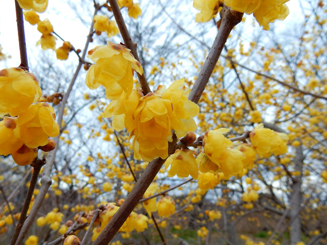 先週末の郷土の森博物館訪問記のつづきです。・°・。プラネタリウムを鑑賞した後、広大な博物館の屋外エリアに出ました。芝生の広場にはスズメくらいの大きさの鳥が群れていて、しきりに地面のエサをついばんでおりました。望遠レンズで覗いてみると、それはアトリさんたちでした。もう少し近づいて観察したかったのですが・・・突然、少し性格の歪んでいるとおぼしき児童が駆け寄って来て、鳥たちを面白半分に何度も驚かせては飛び立たせていたため、かわいそうな小鳥たちはとうとう真冬の貴重なエサ探しをあきらめて、遠くの方へ逃げ去ってしまいました・・・(-_-;) 鳥たちへの同情も含めて、とても不快な気分に陥りましたが・・・気を取り直して敷地の奥の方にあるロウバイ園に参りました。今年は昨年よりも花の数が少なく感じましたが、満開のピークはまだこれからのようでした。青い空を背景に映える黄色い花を撮りたかったのですが、曇天模様もほのぼのと明るくさせる雰囲気と、甘くて優し気な香りを楽しむことが出来ました(*^ - ^*) 隣り合う梅園では紅梅の花も咲いておりました。・°・。厳しい寒さの中にも、着々と春の足音が近づいていることを感じました。・°・。*