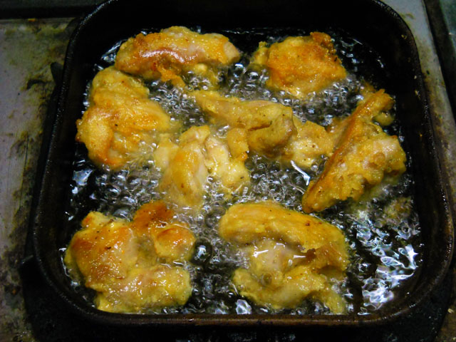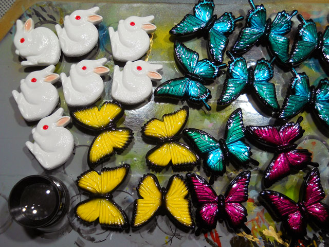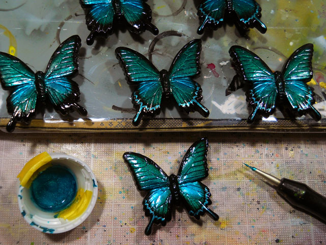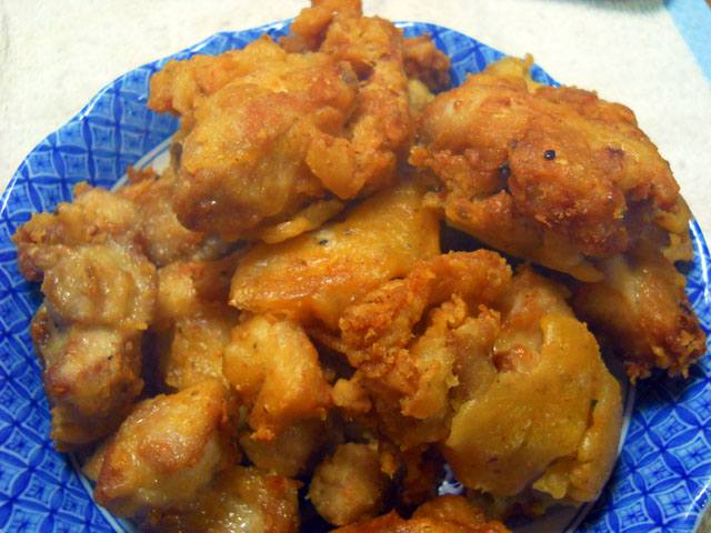 帯留めのカラスアゲハ・夏型・雄バージョンの仕上げの紋入れを行いました。・°・。1頭ずつ手描きでメタリックブルーの塗料を載せていくのですが、左右のバランスを見ながら慎重に最後のドレスアップをこなしてゆきました。・°・。◎ 今日は成人の日でしたが、これでカラスアゲハたちも一人前…いや、一蝶前の立派な新成人…もとい、新成虫になりました。・°・。♪ 鶏もも肉が安くゲットできたので、例の期限切れ間近の片栗粉を使って唐揚げをこさえました。・°・。知人から粉溶きの際に水の代わりに焼酎を使うと、揚げているうちにアルコールが揮発することで、カラッとした食感が保てるよとアドバイスを頂いたのを思い出して、早速試してみることにいたしました。実は以前うちに遊びに来た友人が置いて行った芋焼酎がだいぶ残っていたのですが、わたくし普段はお酒は口にせず、たまに何かメデタイことがあった時などにビールをたしなむ程度なもので、誰にも飲まれないままずっと持て余しておりました。・°・。今回その焼酎を有効活用してみて、その効果を実感いたしました。・°・。二度揚げすることで生焼け状態も回避できて、本当にカリッとサクサクで、中はジューシーなおいしい唐揚げになりました。・°・。◎