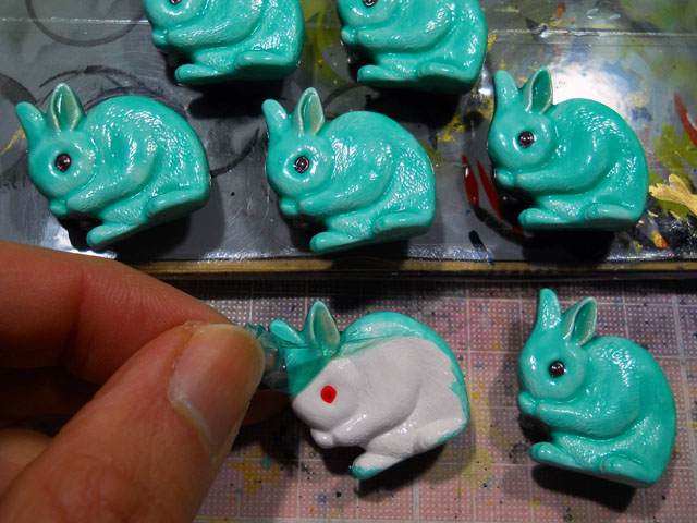 表面の塗装を終えた白うさぎたちの裏面を再塗装する前に、裏の黒色を吹き付ける際に飛沫が白い面を汚さないようにマスキング剤を施しておりましたが、塗装後そのコーティング膜をはがす作業が結構好きです。・°・。マスキングゾルの不気味な緑色に染まったうさぎたちが、ぺりぺりぺりっと小気味良い音を立てながら・・赤い目をした真っ白い姿が現れると、きれいに仕上がった安堵感に満たされます。・°・。◎ 北海道土産にホタテ貝柱の干物をいただきました。・°・。ひと粒ずつ口に含みますと・・しばらくの間、貝柱の繊維の食感や深いうま味が楽しめて最高です。・°・。(o^-^o) 多摩ZOOリポート・その14は昆虫園大温室のバッタの草原にいるトノサマバッタです。・°・。草地から少し離れたところにいた大きな個体は、暗色系で脚の朱色がアクセントになっていて、ちょっとカッコ良いポーズで決めてくれました。・°・。* アトリエ☆イボヤギ 木村大介