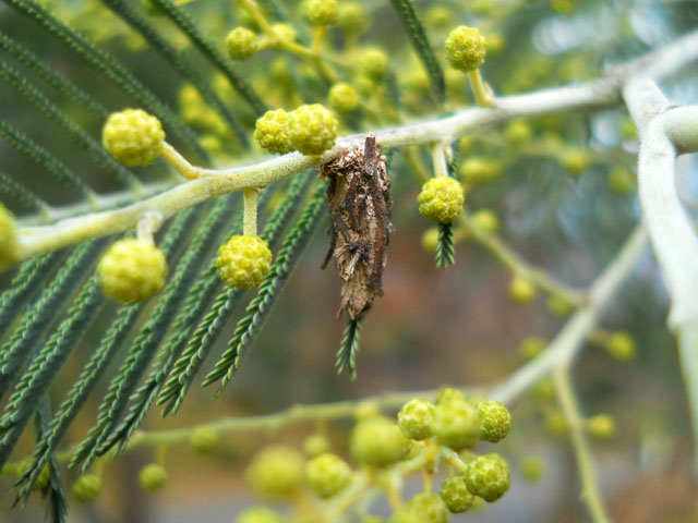 〈本日のタイトル解説:『雪洞のミモザの蕾に紛れる蓑虫』〉