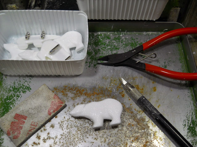 今日はお昼辺りから天気が崩れる予報で、朝焼けも見えたのでやはり降るのかなぁ・・と思いましたが、次第にお日さまが幅を利かせて気温もそこそこ上がりました。・°・。先日見かけたオンブバッタとおそらく同じ個体が、今度は盆栽夏ミカンの葉の上に留まっておりました。・°・。けれどもナミアゲハの幼虫はここしばらく姿を見ておりません。。。・°・。雨の予報が外れたおかげで、湿気が大敵の樹脂の注型作業も、順調に行うことが出来ました。昨日原型が完成した新作帯留めの「ホッキョクグマⅡ」も無事に型抜きが済みました。・°・。*近所の駐車場の周りで猛威を振るっていた、嫌われモノの帰化植物のワルナスビが、痛そうなトゲトゲの枝先にかわいらしい黄色い身をつけておりました。・°・。今日はハロウィンだそうですが、それはなんとなく小さなハロウィンカボチャのようにも見えました。・°・。* アトリエ☆イボヤギ 木村大介